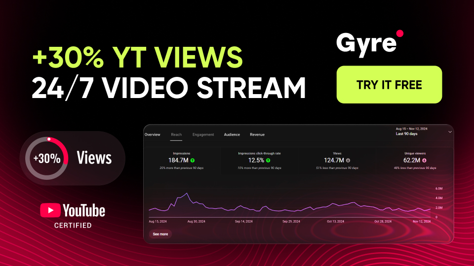 Gyre — a tool for launching 24/7 streams based on pre-recorded content. This cloud platform does not need access to your channel data. All you need to start streaming with Gyre are videos, a computer, and internet access.