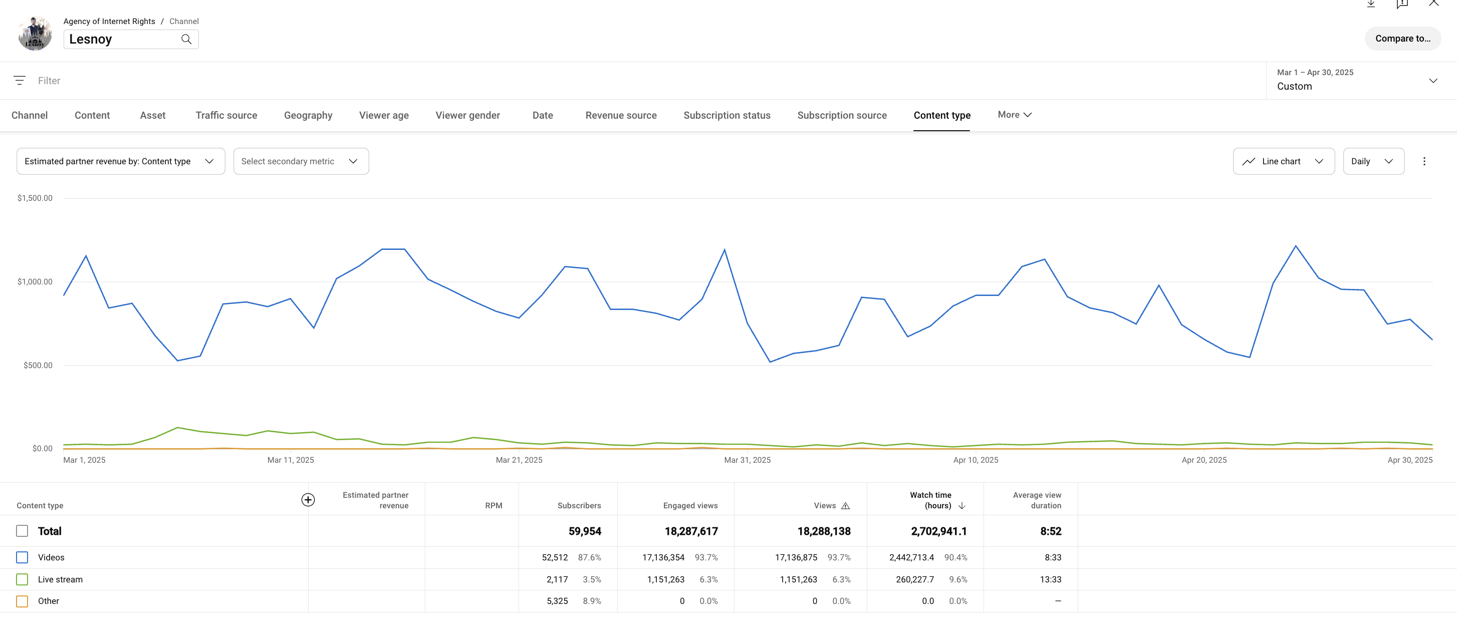 En abril, los resultados de la transmisión cayeron un 44% en comparación con marzo. Importante: la caída no fue solo en la transmisión, sino en todos los tipos de contenido del canal. Este es un caso típico de estacionalidad, que afecta a la mayoría de los nichos.